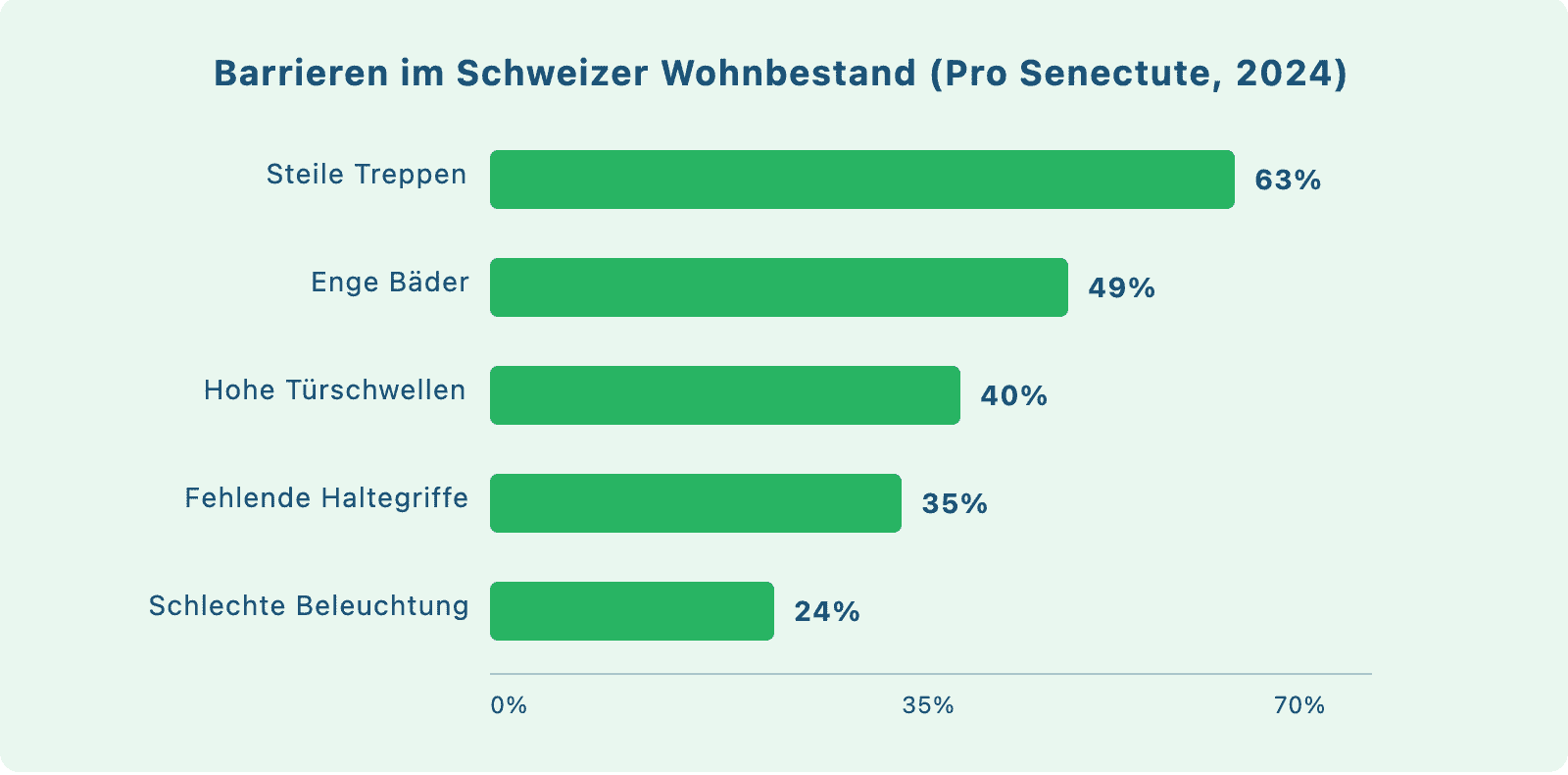 Ein Grossteil der Schweizer Wohnbauten wurde vor 1980 errichtet – in einer Zeit, in der Barrierefreiheit kaum eine Rolle spielte. Die Folge: Viele Haushalte sind heute mit Hürden durchzogen, die für jüngere Menschen kaum auffallen, für ältere jedoch täglich zur Belastung werden.