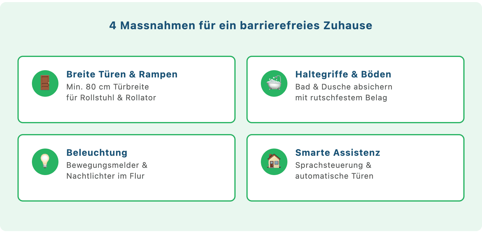 Nicht jede Massnahme erfordert einen grossen Umbau. Viele Anpassungen sind rasch umgesetzt und bringen sofort messbare Verbesserungen im Alltag. Die folgende Übersicht zeigt die vier wirkungsvollsten Massnahmen: