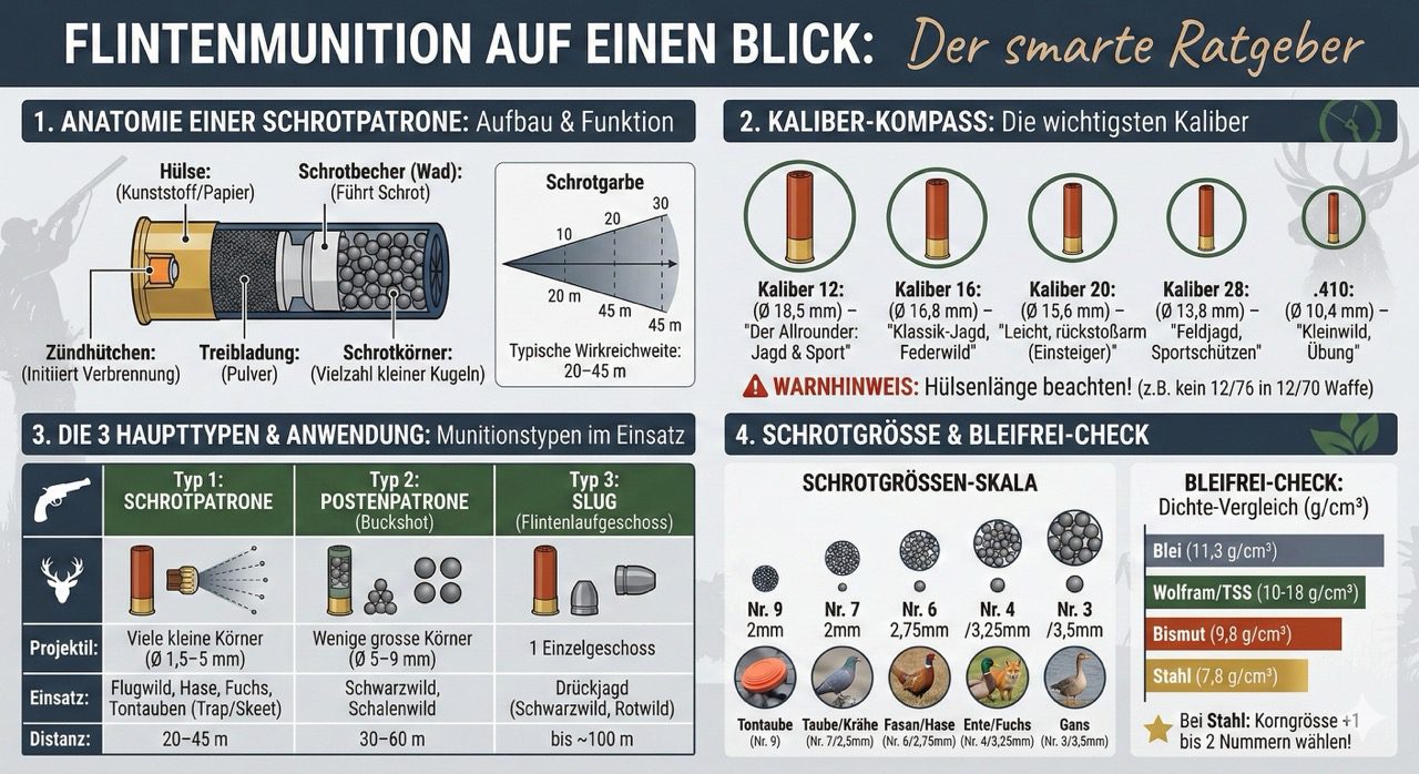 Patronen für Flinten lassen sich in drei Haupttypen einteilen – Schrotpatronen, Postenpatronen und Flintenlaufgeschosse (Slugs). Die richtige Wahl hängt von Kaliber, Schrotkorngrösse, Verwendungszweck (Jagd oder Sport) und den geltenden gesetzlichen Vorgaben ab.