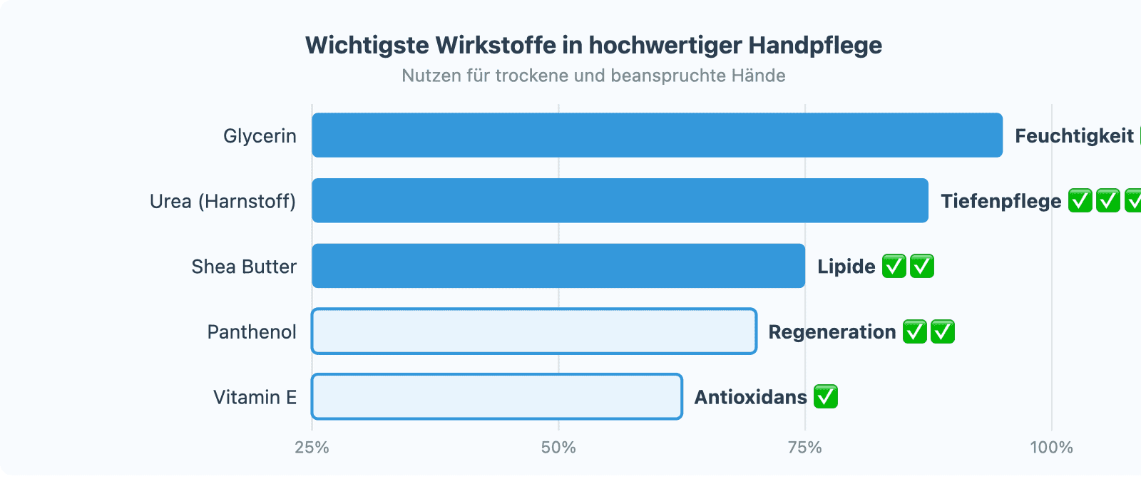 Nicht jede Handcreme ist gleich wirksam. Der Unterschied liegt in den Inhaltsstoffen und ihrem Wirkprinzip. Hochwertige Produkte kombinieren mehrere Wirkstoffgruppen: